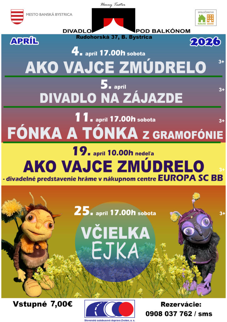 Milí naši diváci predstavujeme Vám náš program na APRÍL 2026 . Máte sa naozaj na čo tešiť. Pripravili sme pre Vás predstavenia, ktoré Vás určite pobavia. Preto neváhajte a príďte k nám na Rudohorskú 37 Sásová.